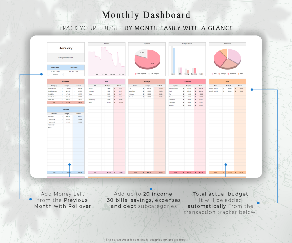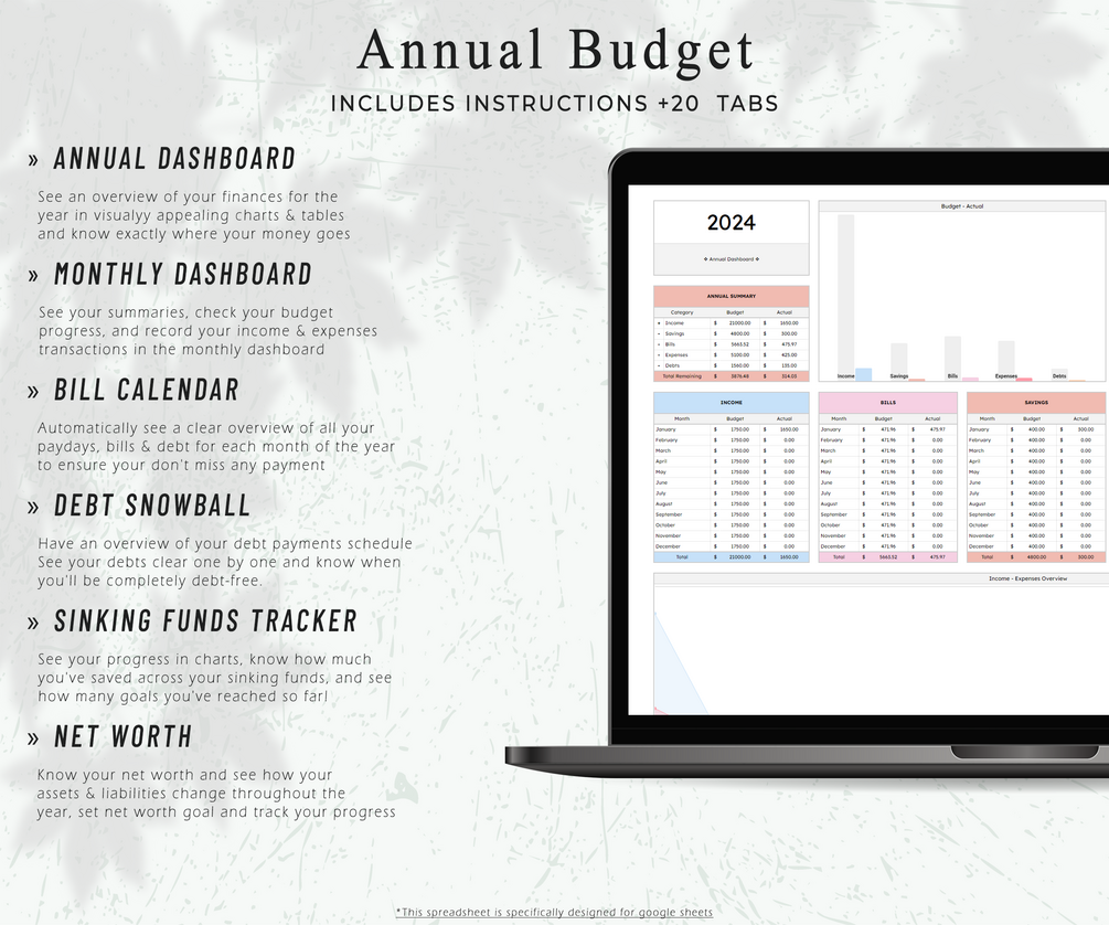 Start budgeting with our easy to use annual budget template! This annual budget planner is designed for Google Sheets and is the spreadsheet you need if you are planning to start a budget! This annual budget spreadsheet contains 20 tabs: