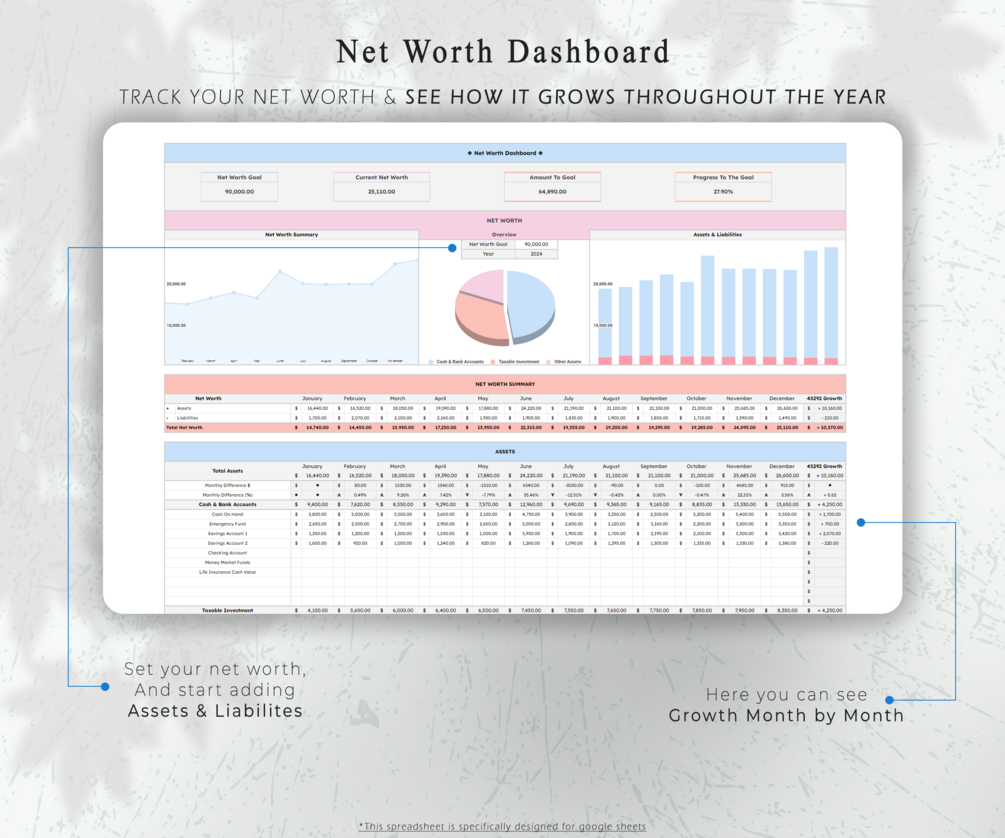 • A net worth tracker so you can easily keep track of your net worth for each month