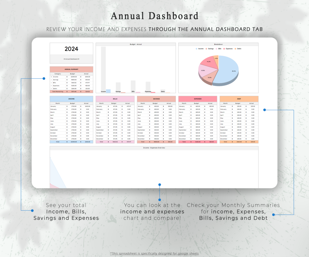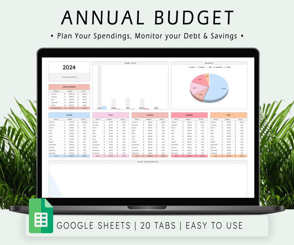 Start budgeting with our easy to use annual budget template! This annual budget planner is designed for Google Sheets and is the spreadsheet you need if you are planning to start a budget! This annual budget spreadsheet contains 20 tabs: