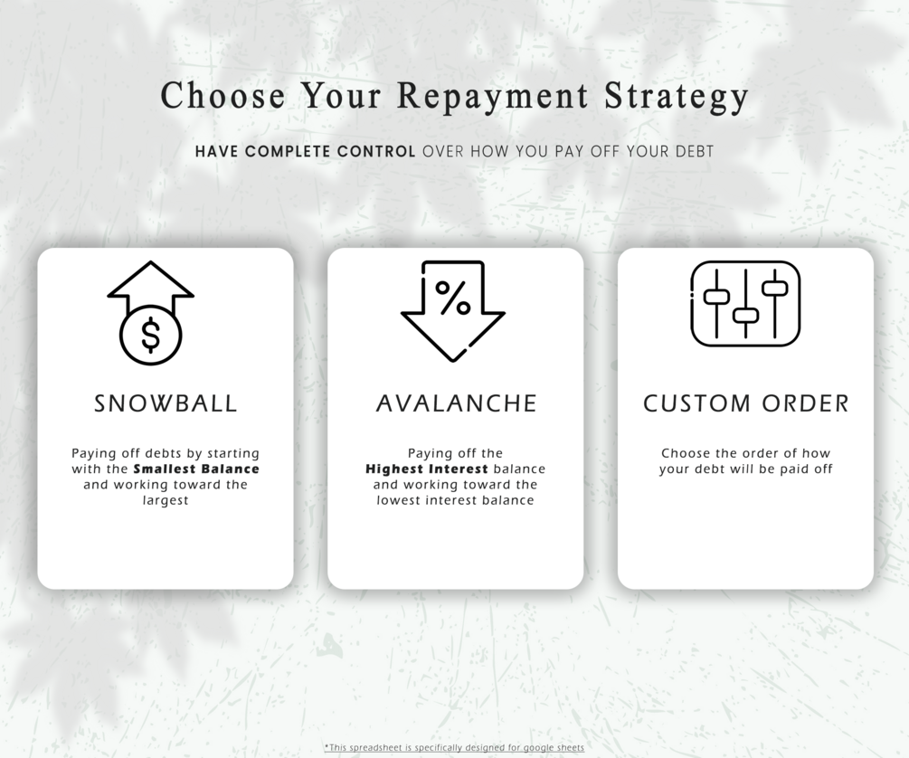 Choose from the 3 different debt repayment strategies: 1) the Debt Snowball Method, 2) the Debt Avalanche Method, and 3) Custom Order (choose how your debts would be prioritized). Easily compare your interest payments and debt-free dates for each strategy, and decide on the best debt repayment method to use.