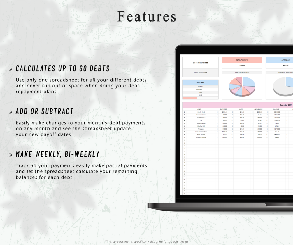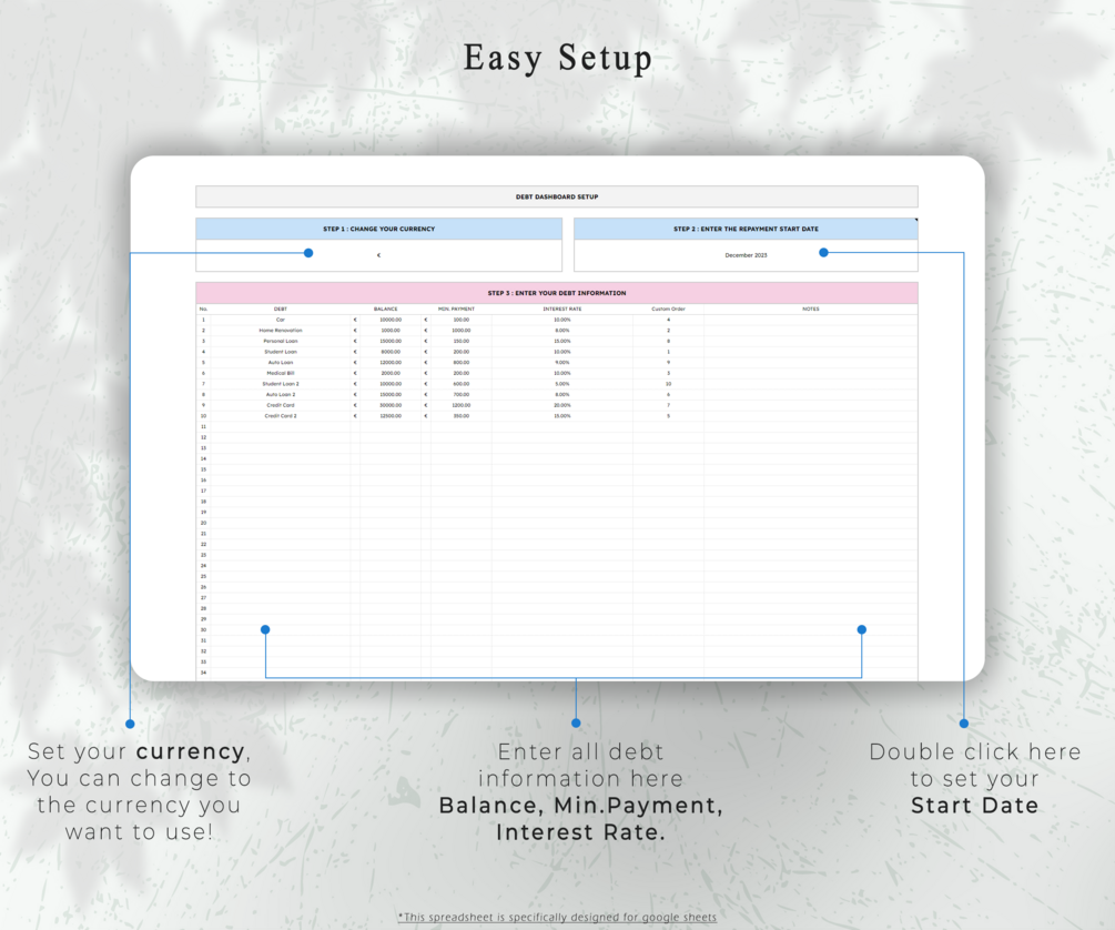 Includes only the things you need and is made to be simple, easy to understand, yet visually appealing. All you have to do is enter your debt information and watch the spreadsheet do all the legwork!