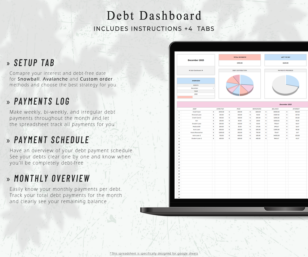 Jumpstart your journey to becoming debt-free and easily have a debt repayment plan with this Ultimate Debt Dashboard Spreadsheet. See when you will fully repay your debts and have all the calculations done for you! Plus, the spreadsheet is made to be flexible - easily make additional debt payments on any month and see your new monthly payments and payoff dates change automatically!