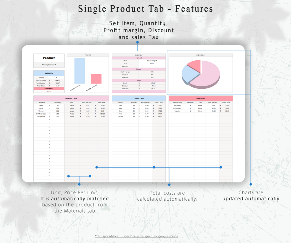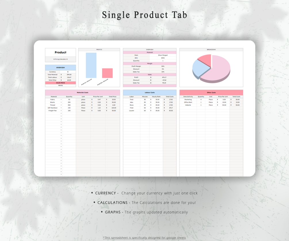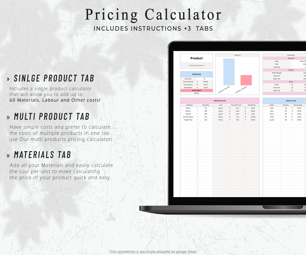 Our Pricing Calculator is the perfect tool to to price your items! Track your material inventory, keep a close eye on supplier pricing, create comprehensive product listings and accurately price your products.